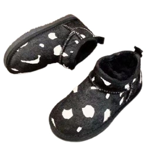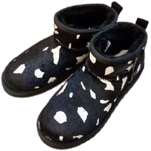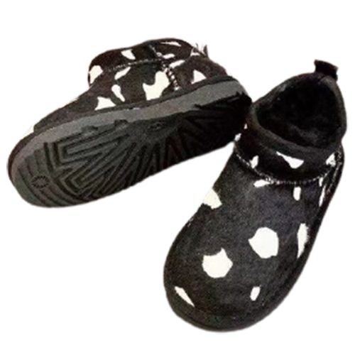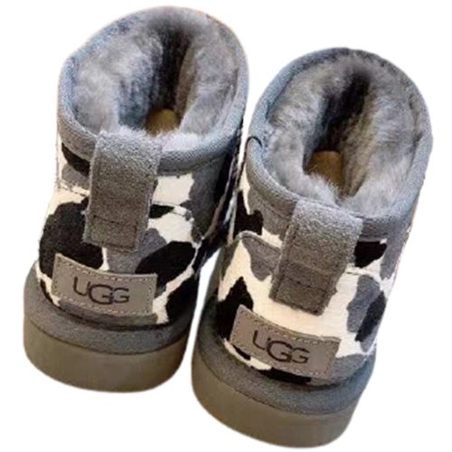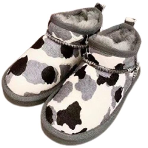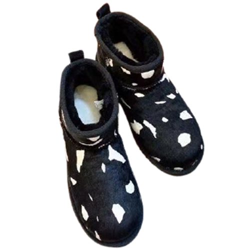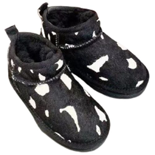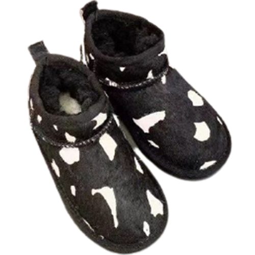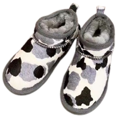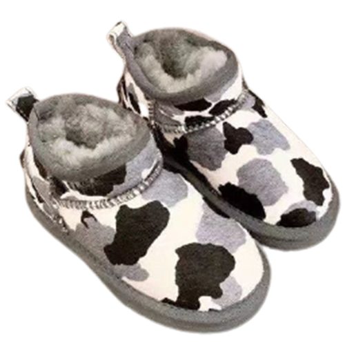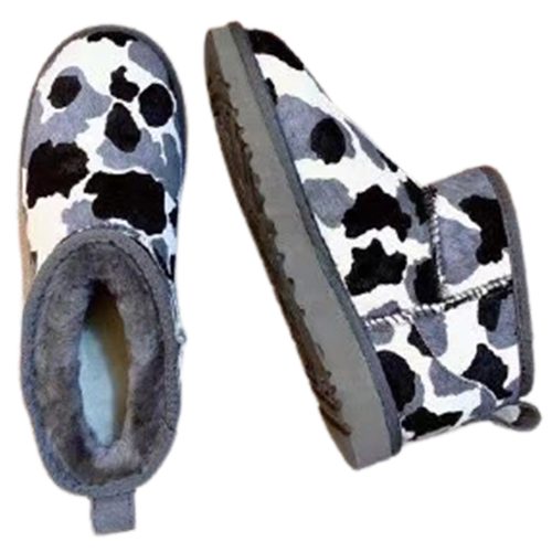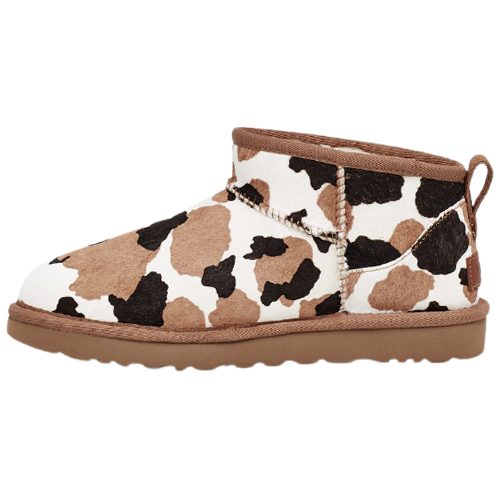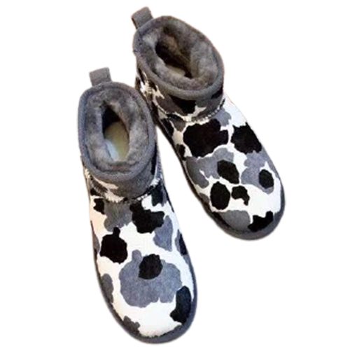 מגפי UGG Classic Mini Cow בעיצוב ייחודי עם דוגמת פרווה דמוית פרה, המשלבת נוחות, חום וסטייל.